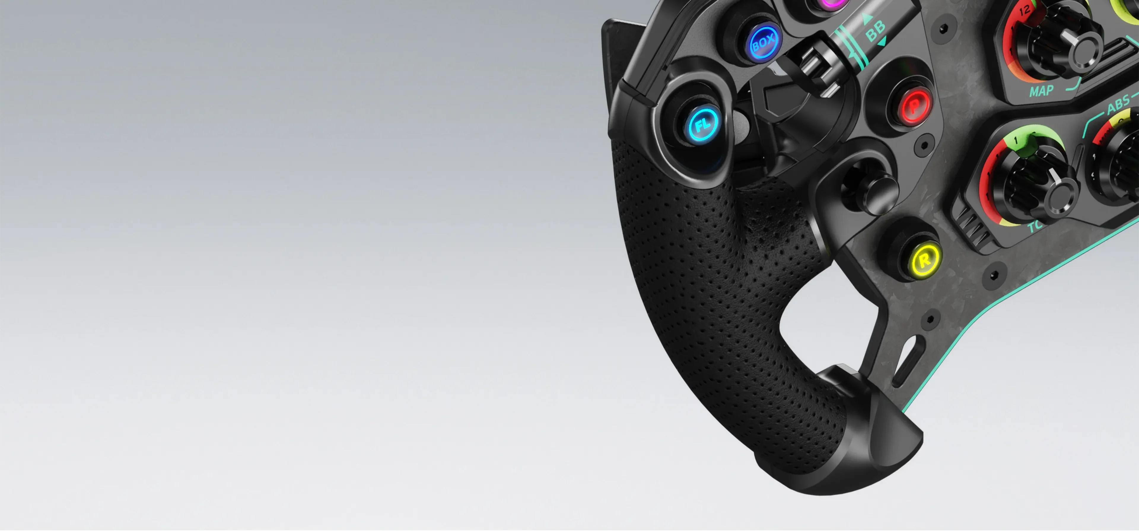 The GS magnetic carbon paddles have a powerful weight to them, ensuring every shift feels satisfying. The lower clutch paddles are easily toggled between a single clutch or dual clutch mode, typically used in professional simracing titles such as iRacing and the F1 series.
