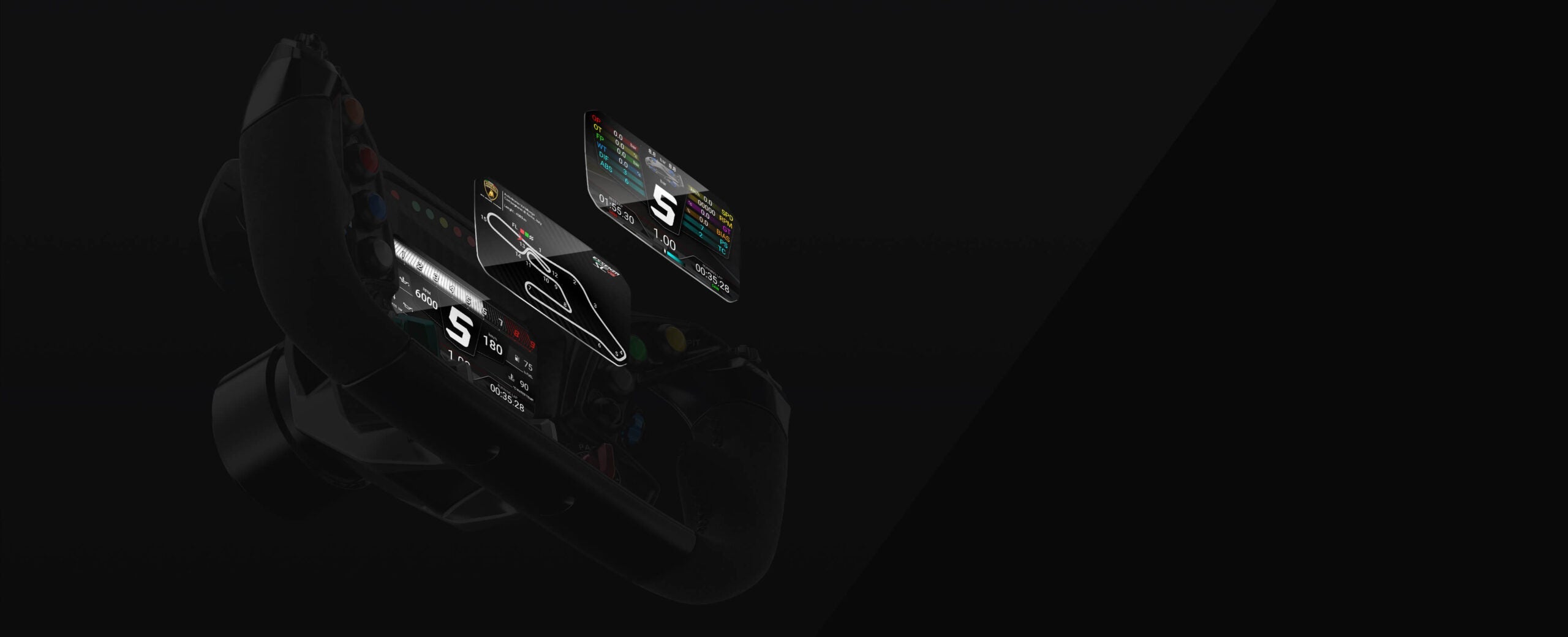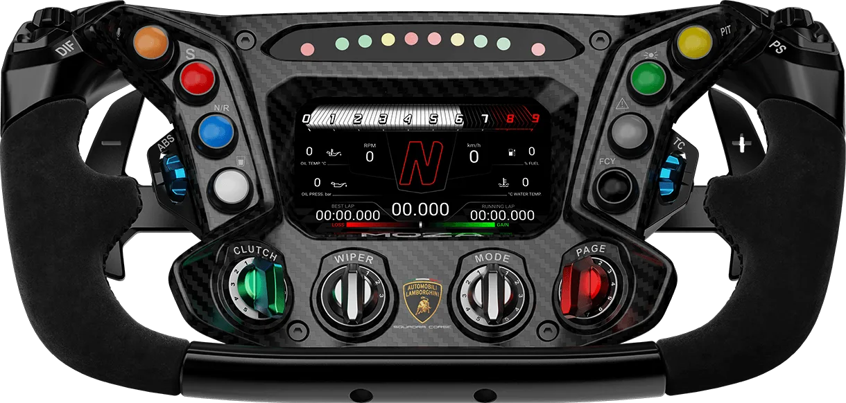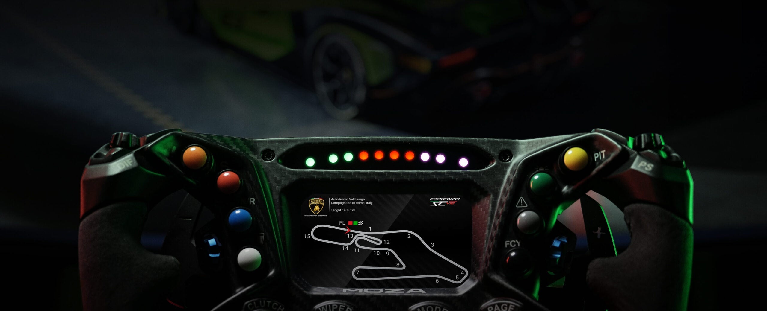 This premium sim racing wheel replicates the steering wheel of the Automobili Lamborghini Essenza SCV12 hypercar, a limited edition masterpiece with just 40 cars built.
