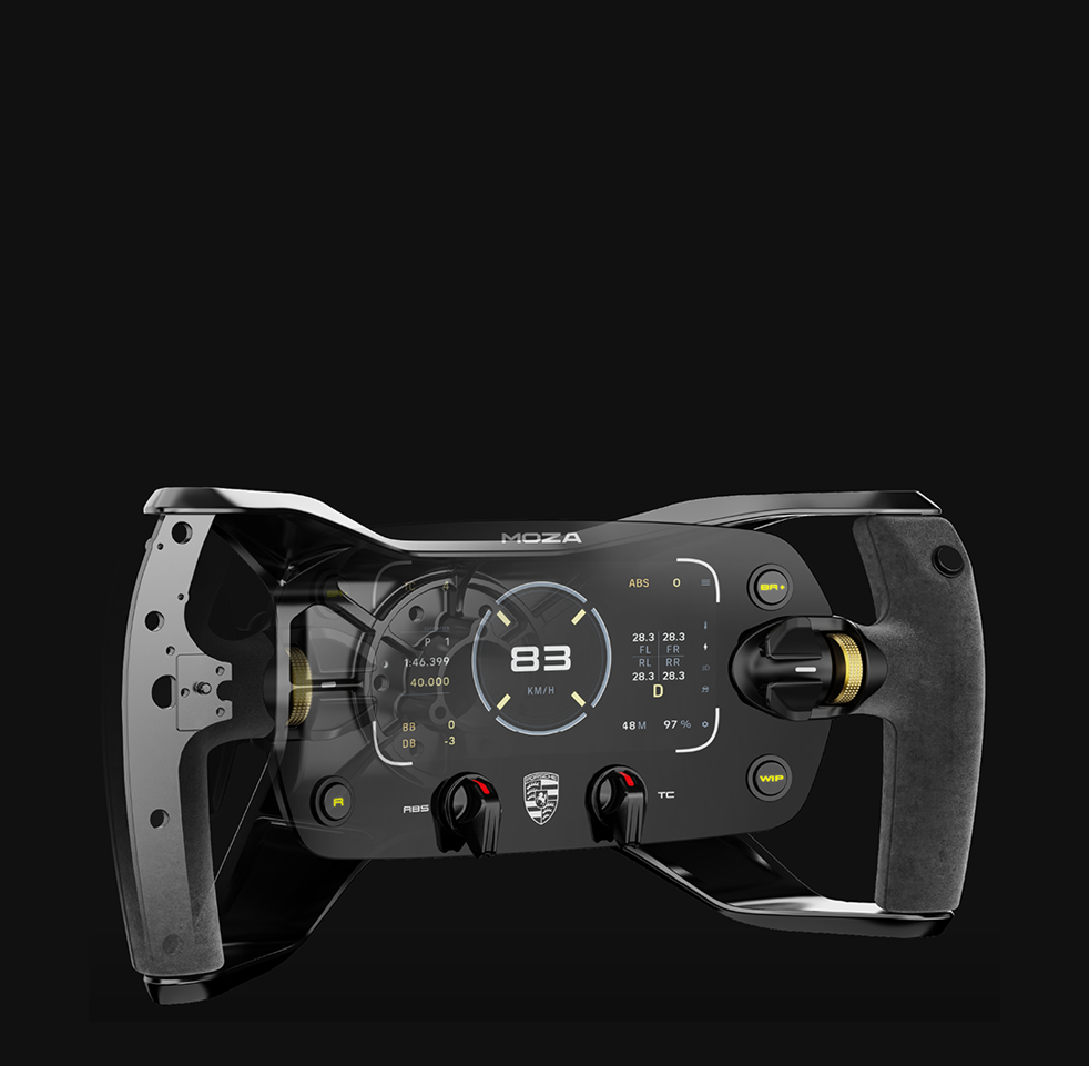 The MOZA Porsche Mission R Steering Wheel is an officially licensed replica crafted with Porsche’s original CAD data. Featuring a 5.4-inch flexible OLED display, CNC-machined aluminum frame, suede-like grips, and dual-clutch magnetic paddles, it delivers the ultimate balance of authenticity, performance, and comfort for professional sim racing.
